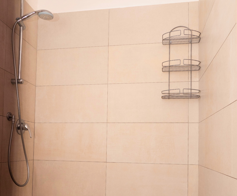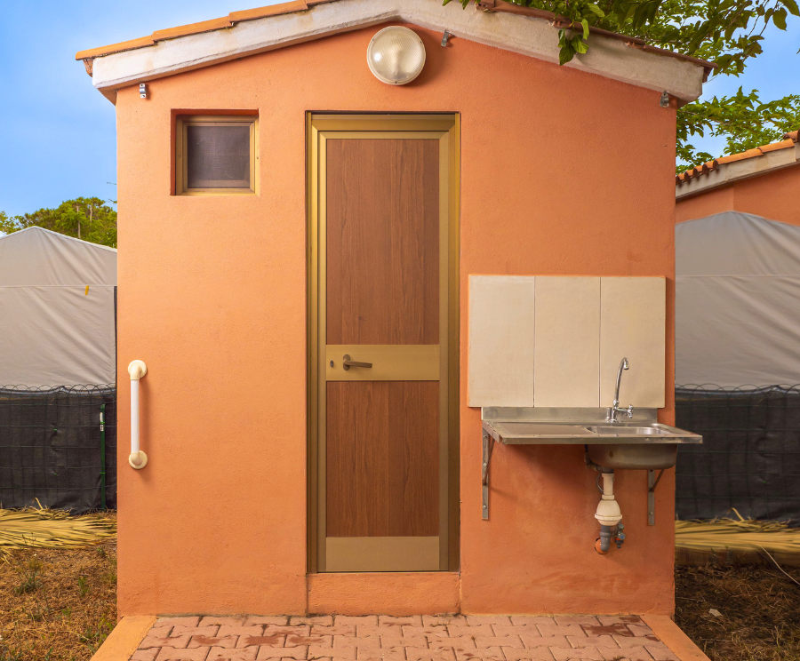 En eigenes gemauertes Badezimmer direkt neben dem Zelt, ausgestattet mit Dusche, sorgt für Komfort und Unabhängigkeit im Urlaub.